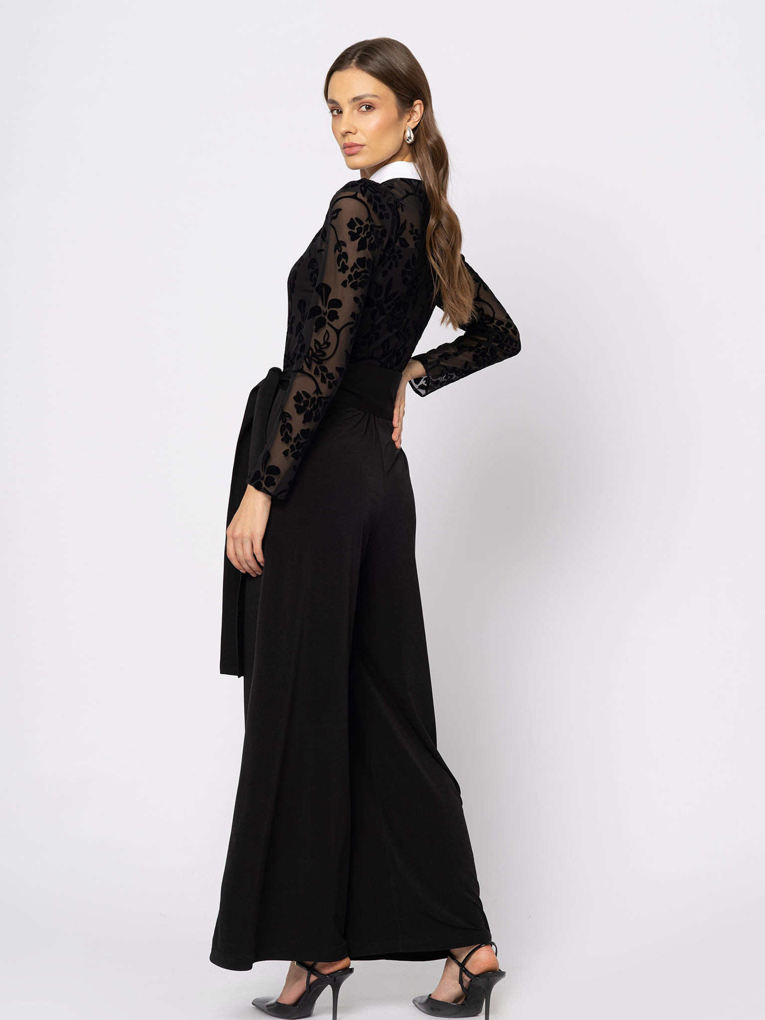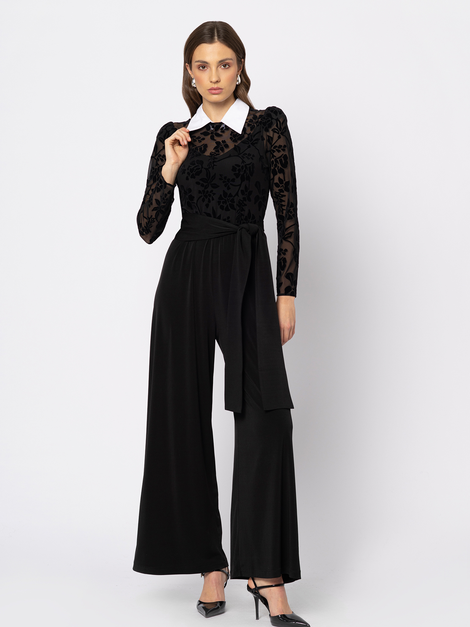 Czarny kombinezon z siatkową górą w flokowany wzór i kontrastowym kołnierzykiem Louise