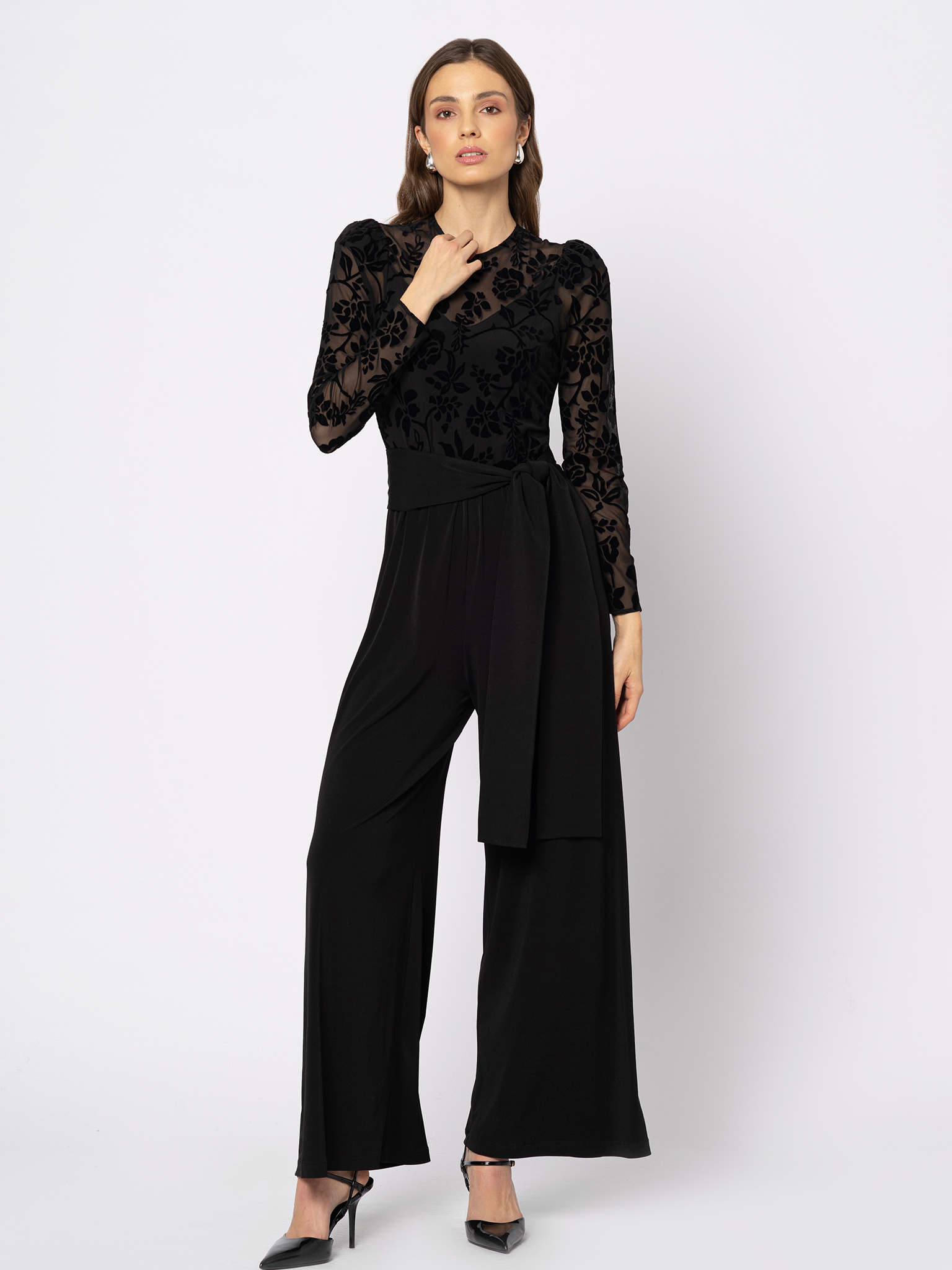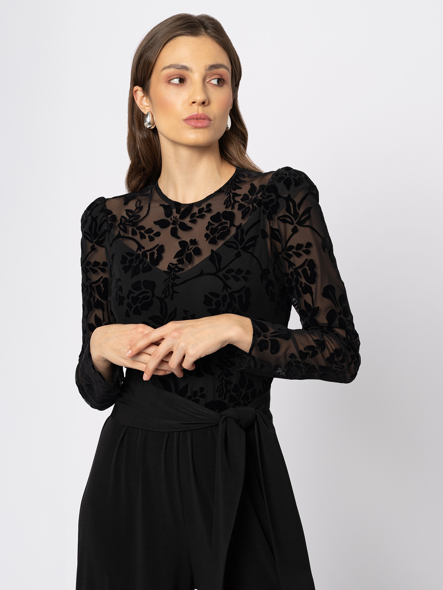 Góra kombinezonu została wykonana z transparentnej czarnej siatki we flokowany kwiatowy wzór – miękkim, aksamitnym nadrukiem dodającym głębi i dekoracyjnego wykończenia. Pod spodem znajduje się podszewka, dzięki czemu ciało pozostaje subtelnie zasłonięte, a przezroczysty dekolt i rękawy dodają lekkości i zmysłowego uroku. Na ramionach widoczne są delikatne bufki, wprowadzające nutę romantycznej kobiecości.