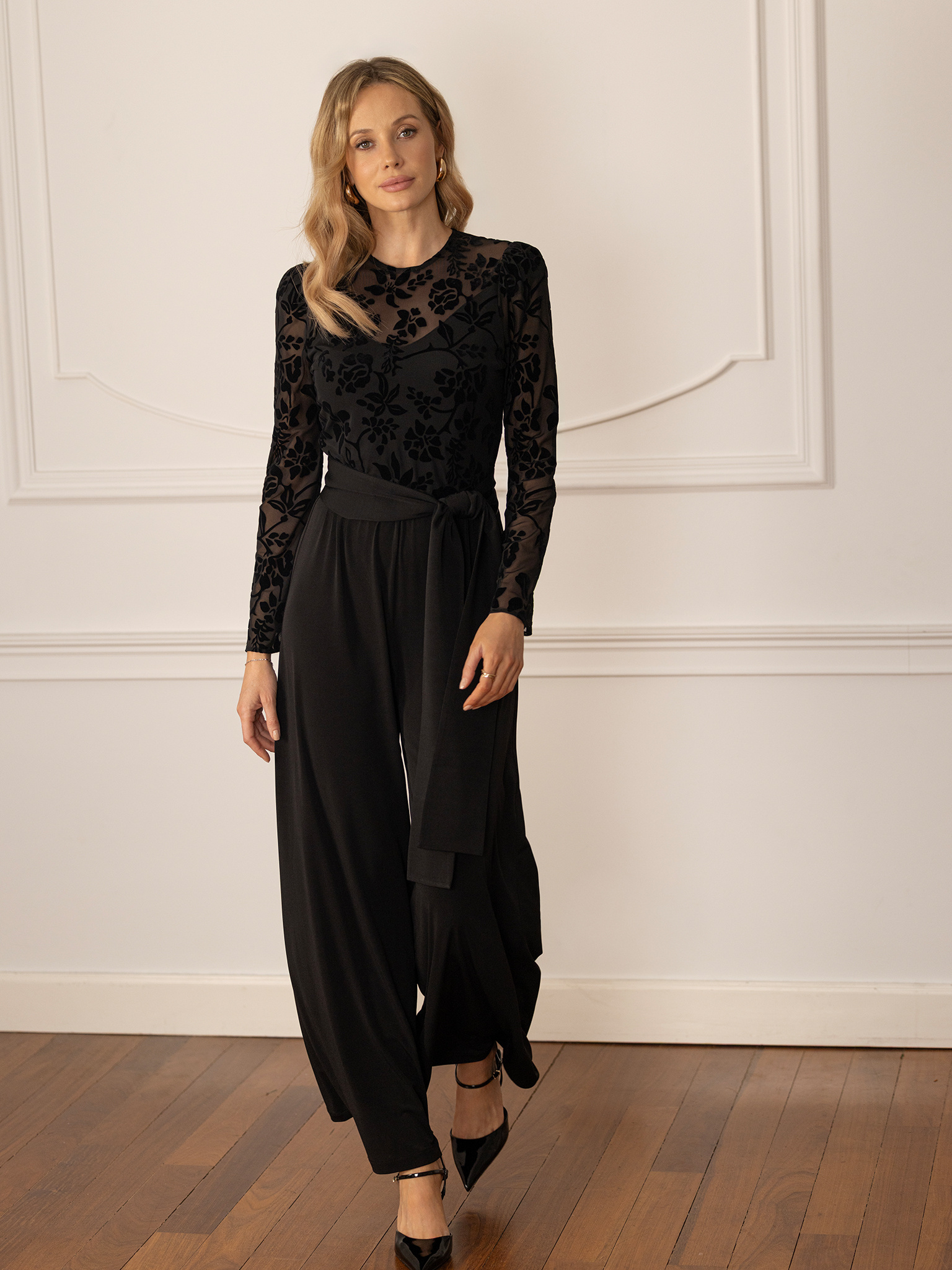 Góra kombinezonu została wykonana z transparentnej czarnej siatki we flokowany kwiatowy wzór – miękkim, aksamitnym nadrukiem dodającym głębi i dekoracyjnego wykończenia. Pod spodem znajduje się podszewka, dzięki czemu ciało pozostaje subtelnie zasłonięte, a przezroczysty dekolt i rękawy dodają lekkości i zmysłowego uroku. Na ramionach widoczne są delikatne bufki, wprowadzające nutę romantycznej kobiecości.
