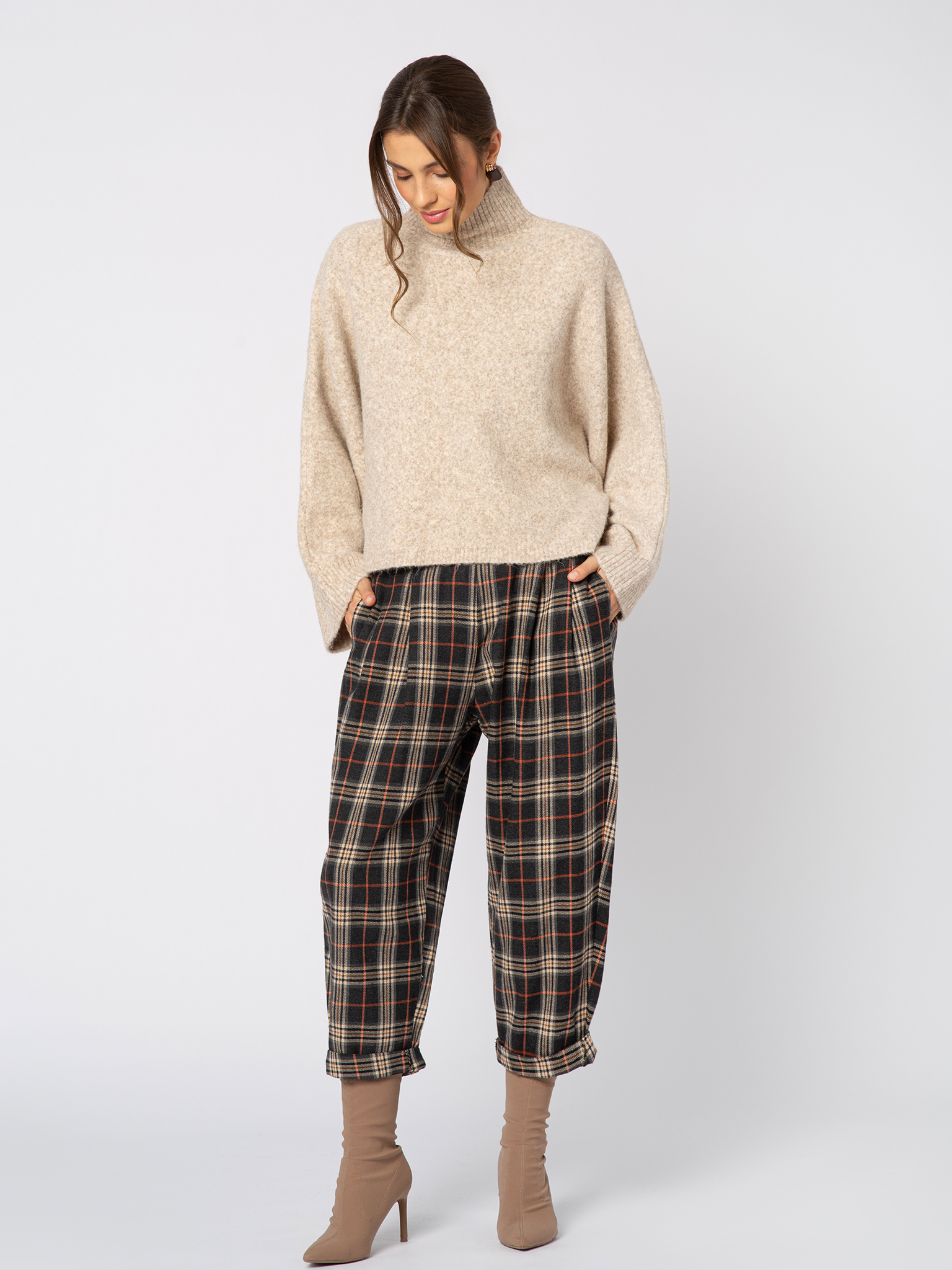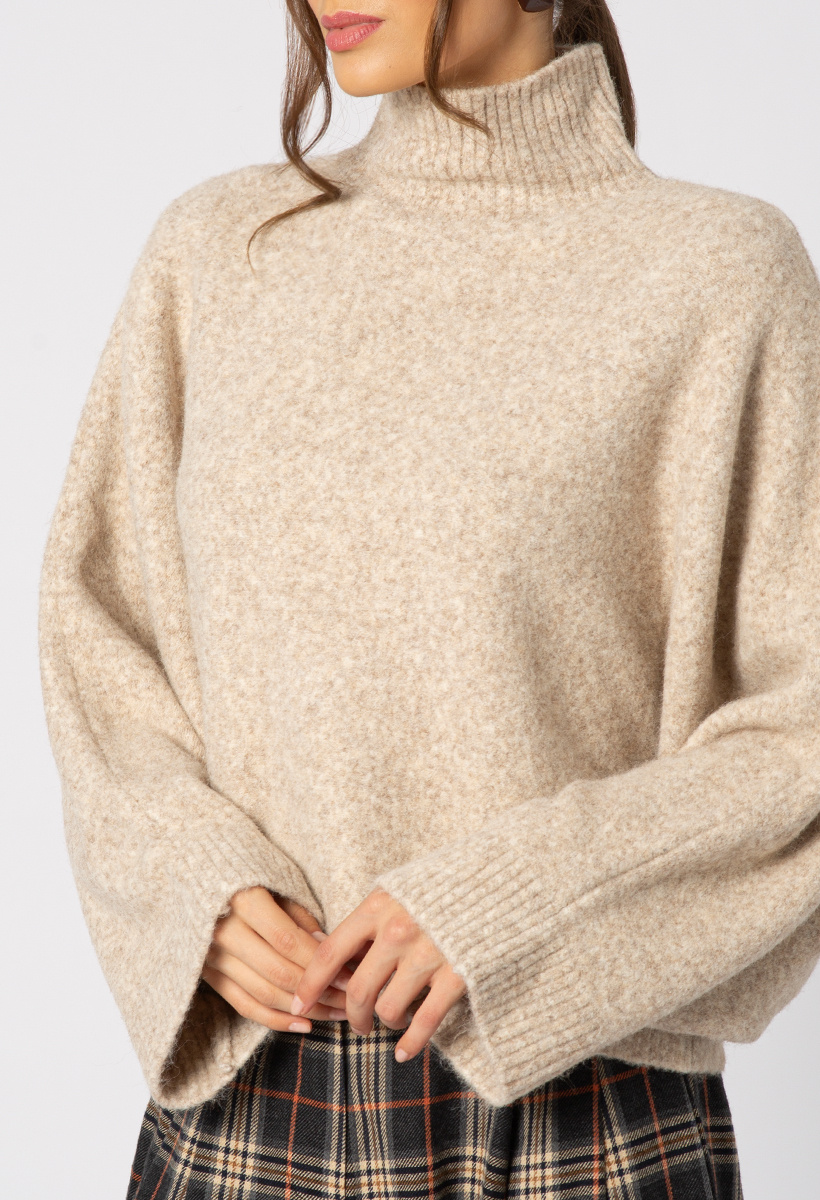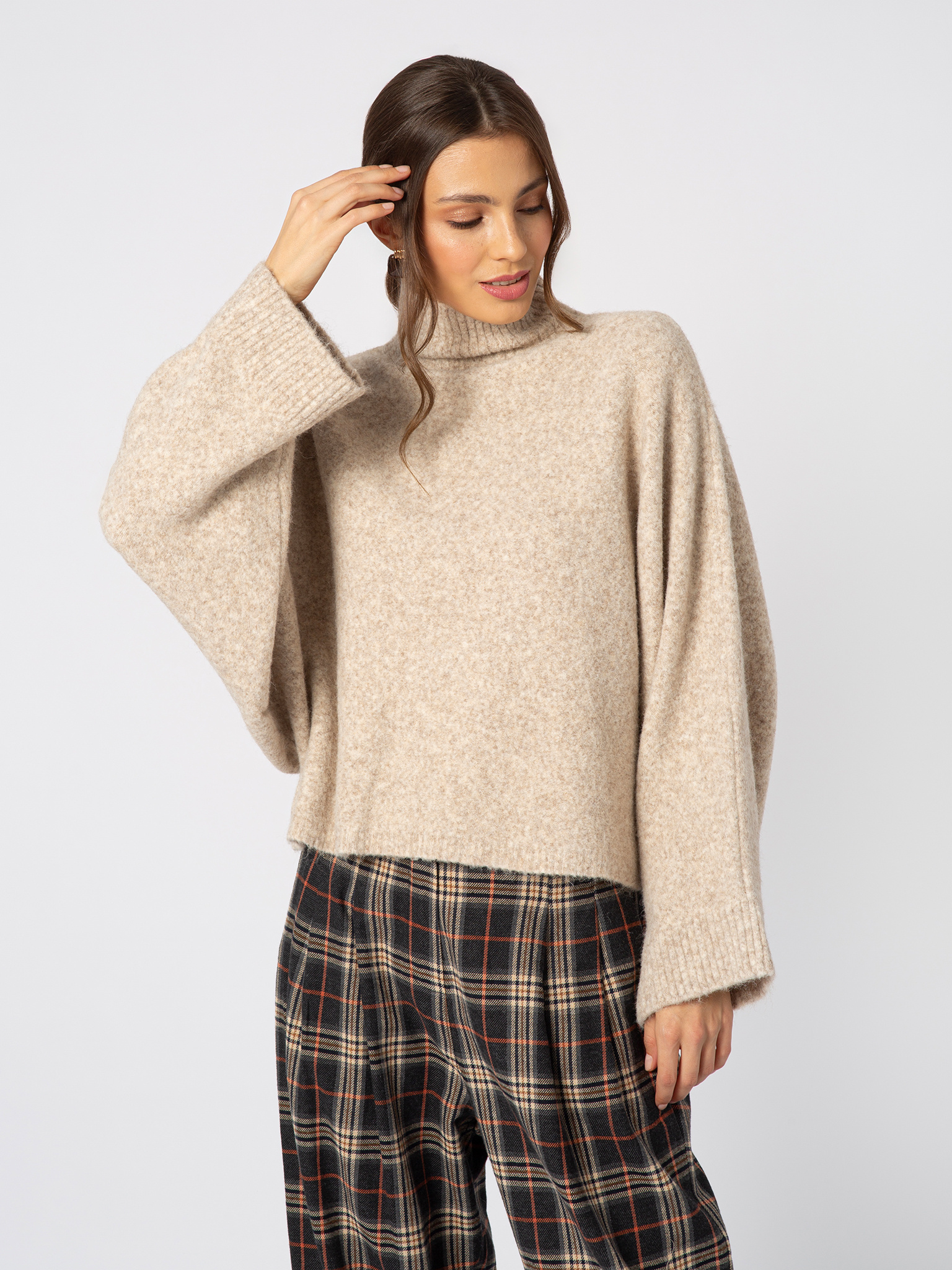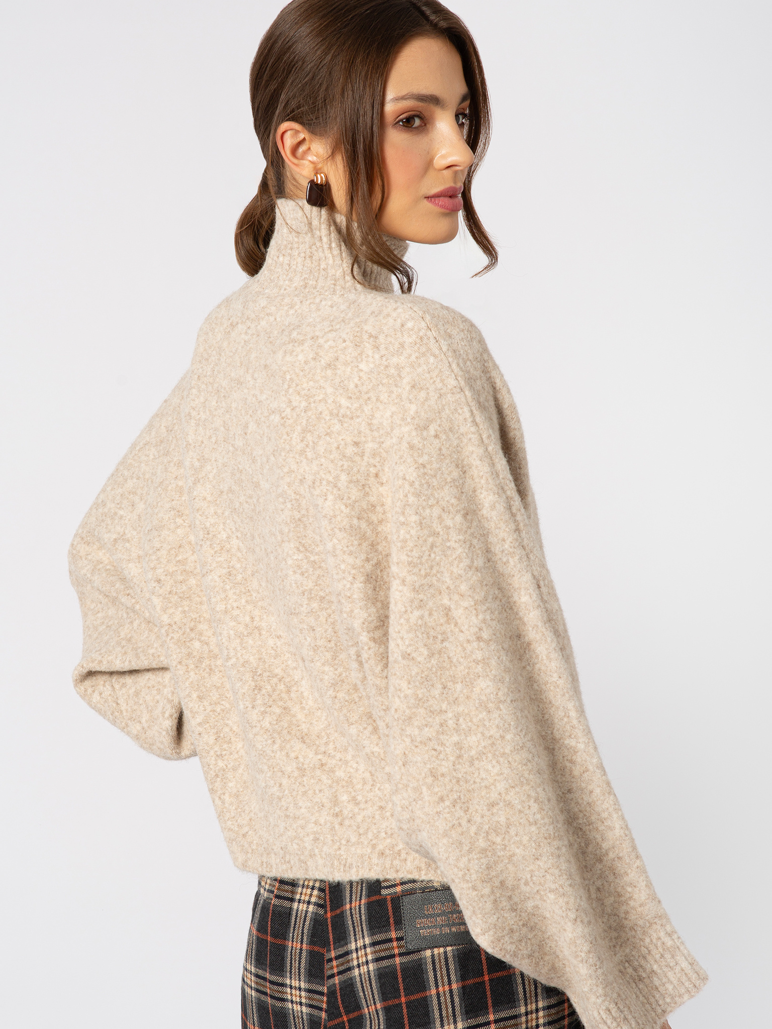 Otula jak ciepłe wspomnienie spokojnego poranka. Ten sweter w odcieniu beżowego melanżu został zaprojektowany tak, byś czuła się w nim swobodnie i wyjątkowo każdego dnia. Ma prosty, pudełkowy krój, który pięknie układa się na sylwetce. Szerokie rękawy dodają mu nowoczesnego luzu, a dopasowany golf podkreśla linię szyi, nadając całości delikatnej elegancji.