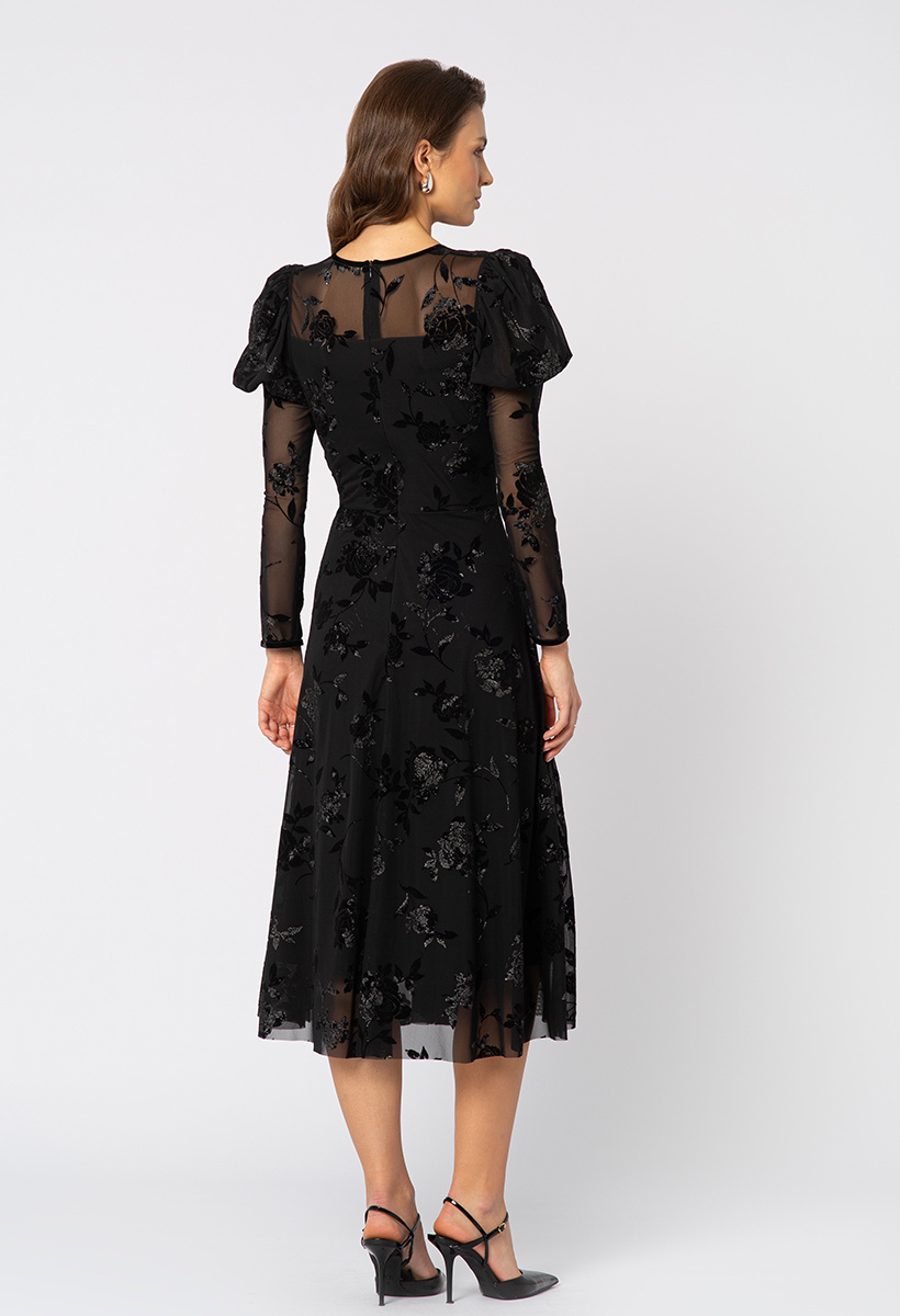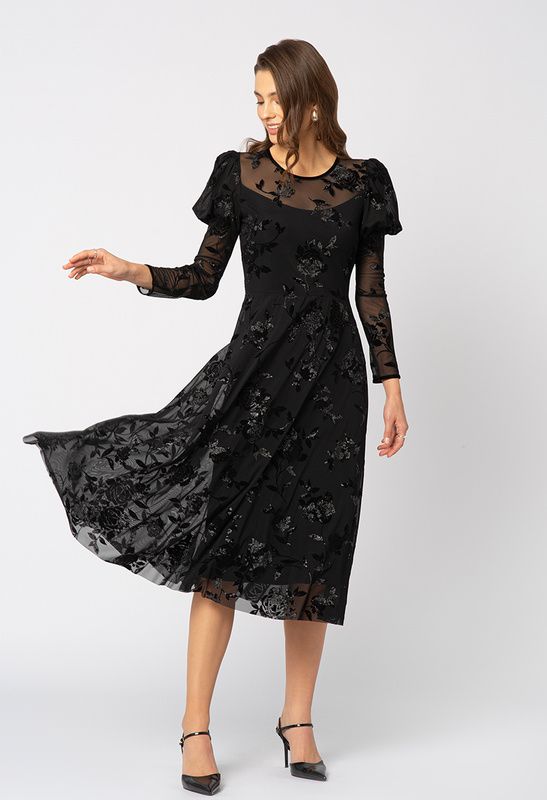 Czarna sukienka z siatki w srebrne róże i welurowym paskiem