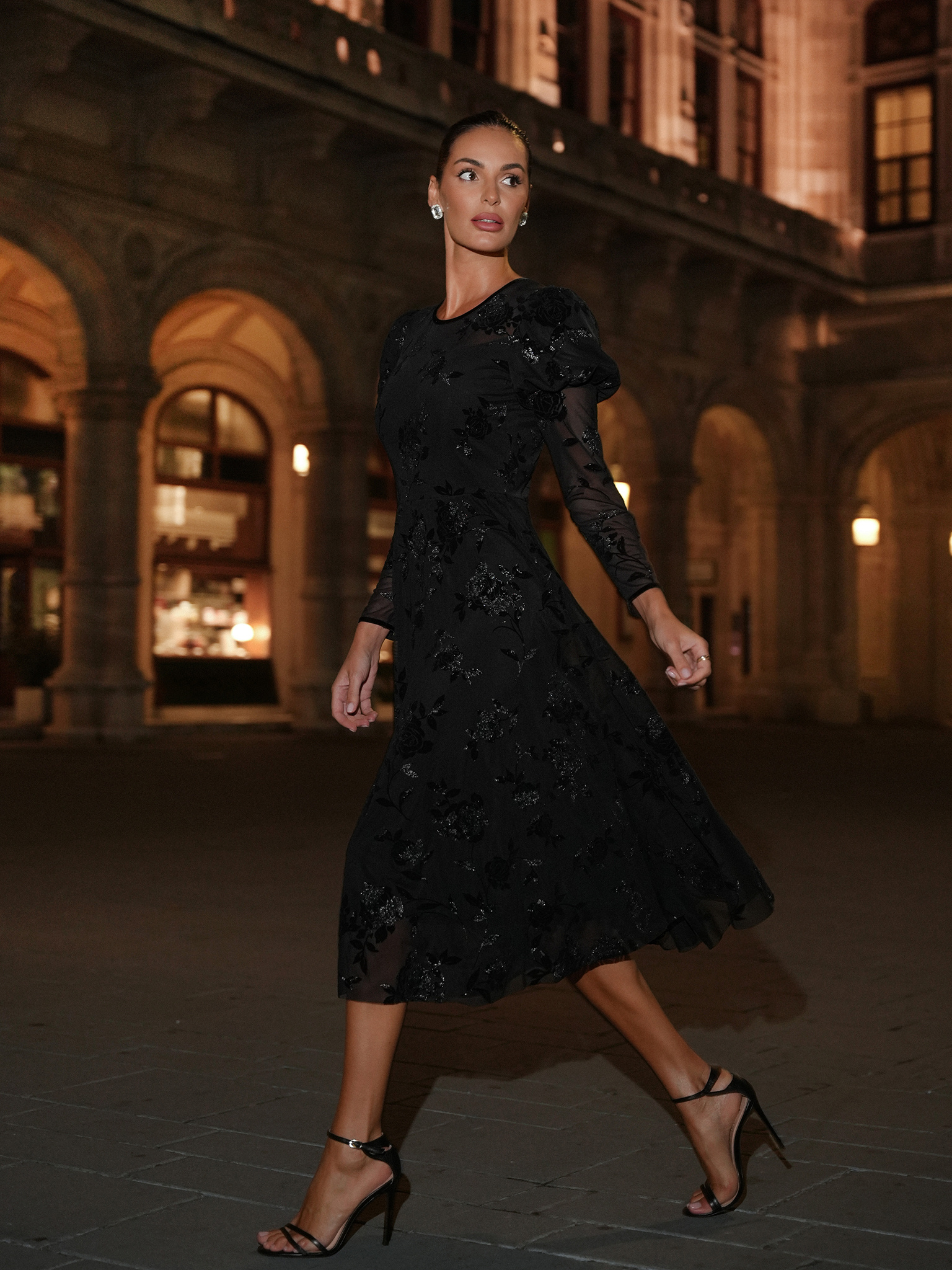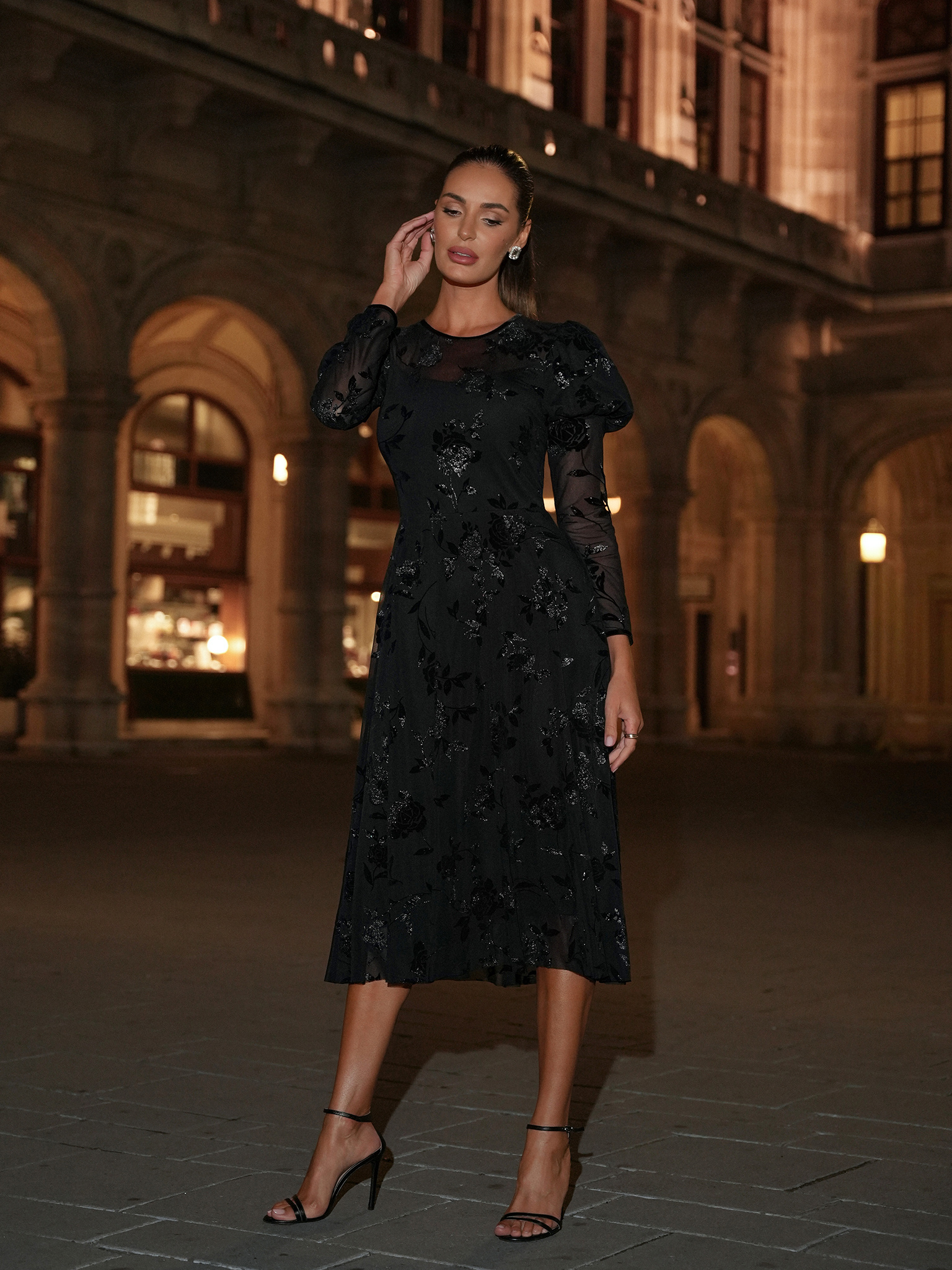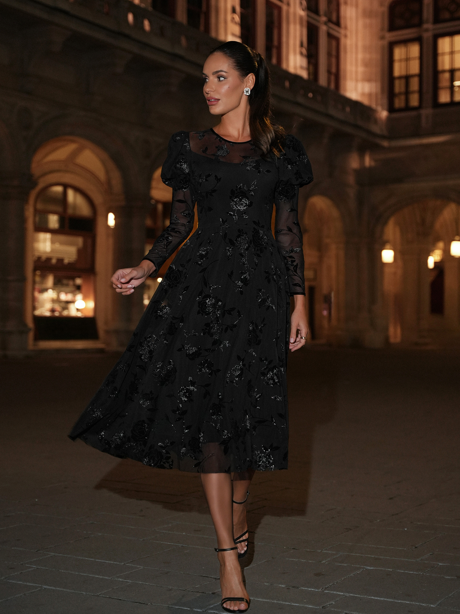 Czarna sukienka z siatki z bufkami w srebrne róże Claire