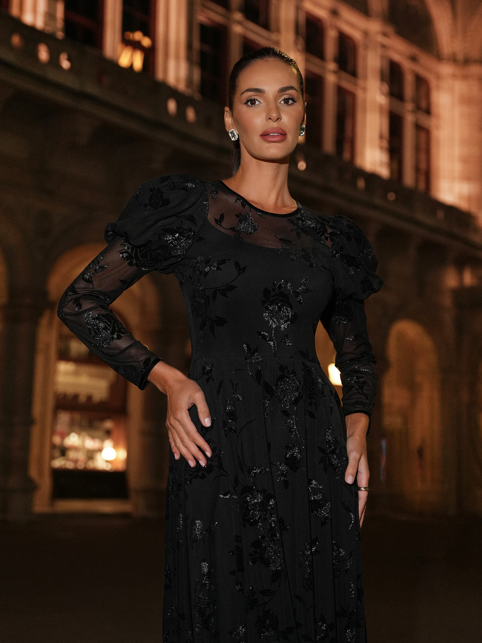 To sukienka, która porusza się razem z Tobą. Claire sprawia, że czujesz się lekko, kobieco i absolutnie wyjątkowo — jak bohaterka własnej historii. Przezroczysta, czarna siatka z delikatnie połyskującymi srebrnymi różami tworzy subtelny trójwymiarowy efekt, który przyciąga wzrok przy każdym kroku. To elegancja, która pozostaje romantyczna, ale ma w sobie współczesny charakter.