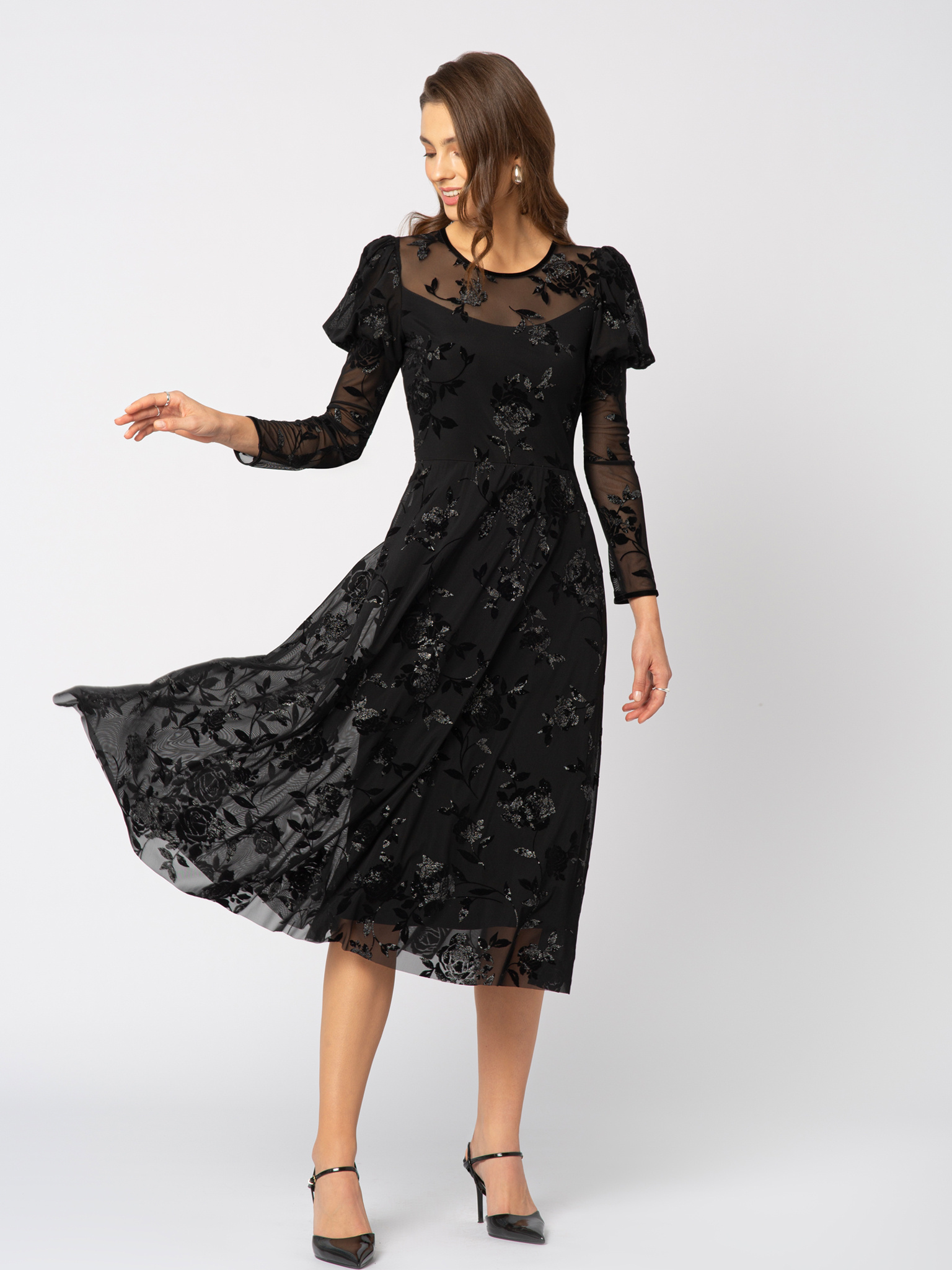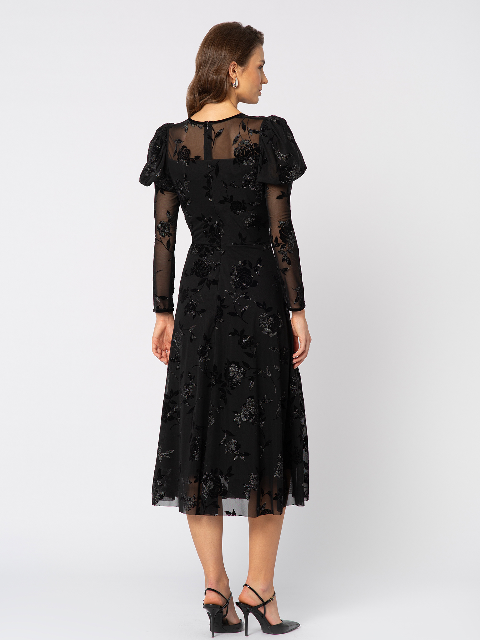 Czarna sukienka z siatki z bufkami w srebrne róże Claire