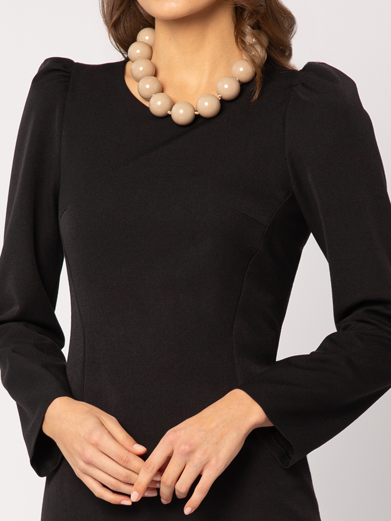 Długość za kolano nadaje jej elegancji, a delikatny rozporek z tyłu dodaje zmysłowości i zapewnia swobodę ruchów. Długie, dopasowane rękawy oraz subtelne bufki na ramionach dodają sylwetce szlachetnego kształtu, tworząc piękną, wyważoną linię. Okrągły dekolt zachowuje minimalistyczny charakter, dzięki czemu całość prezentuje się nowocześnie i ponadczasowo.