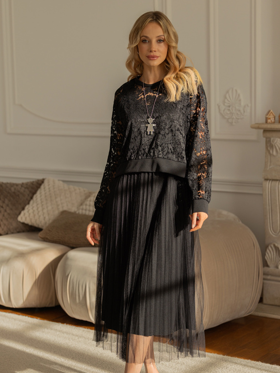 Czarna sukienka z plisowaniem i koronkową bluzką