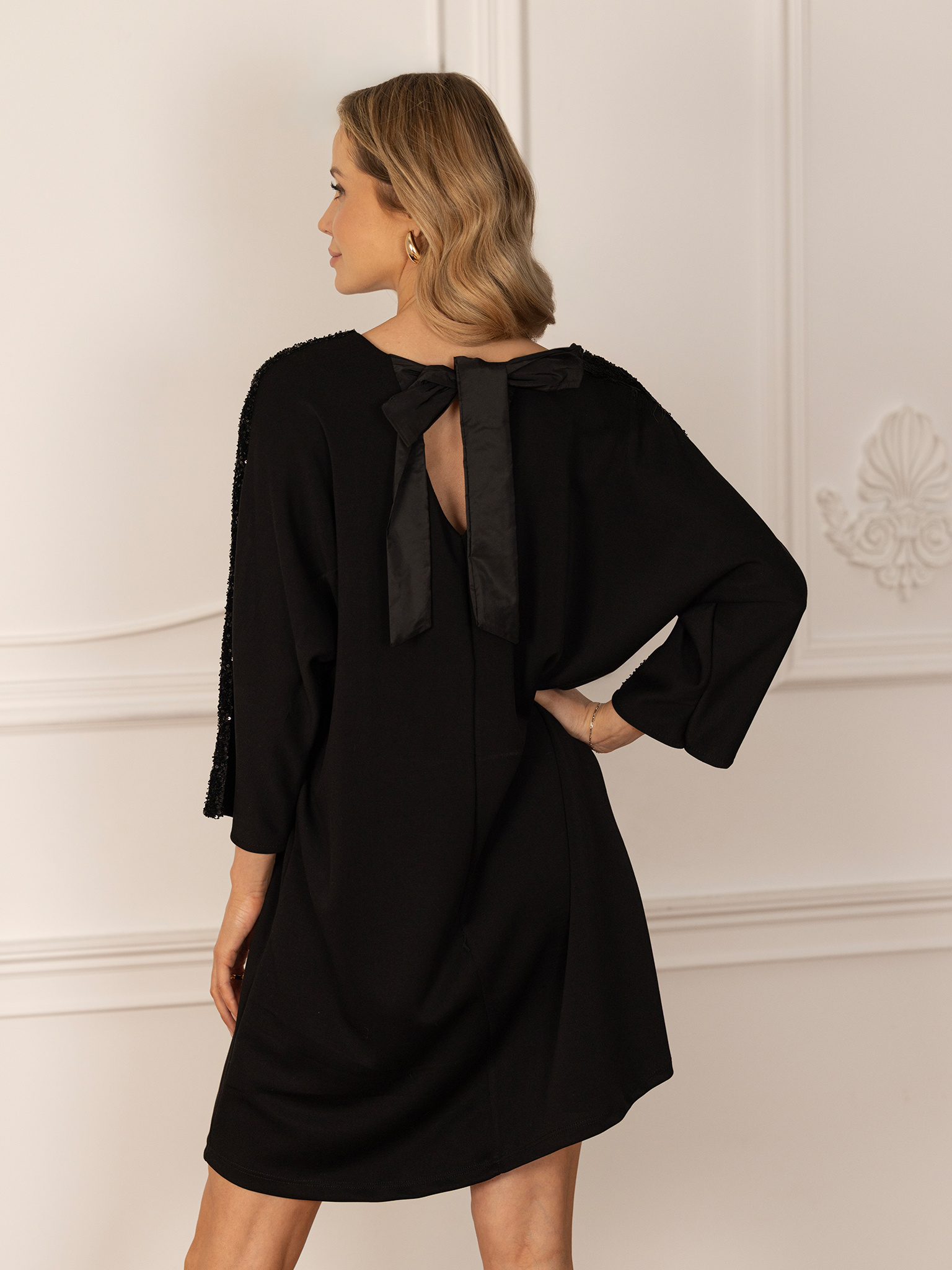 Czarna sukienka z cekinami na ramionach i kokardą na plecach