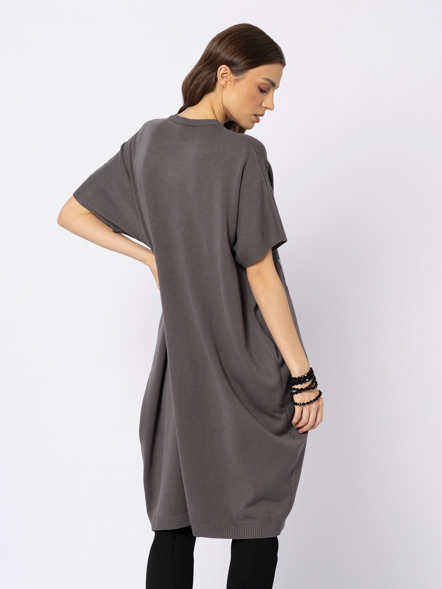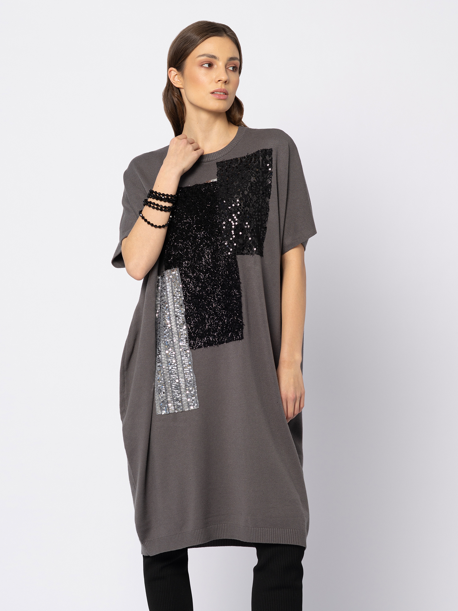 Szara dzianinowa sukienka z ozdobnymi aplikacjami