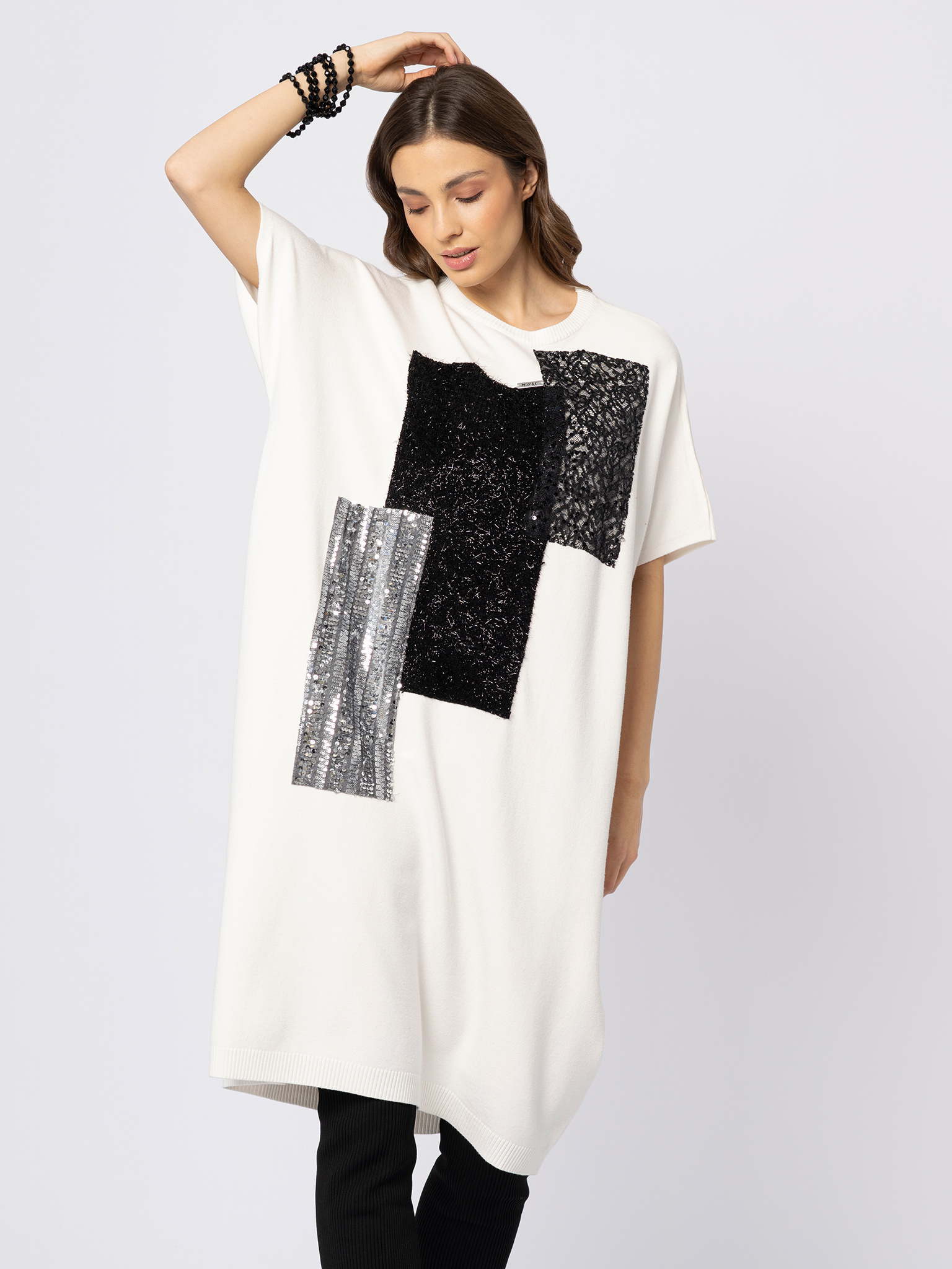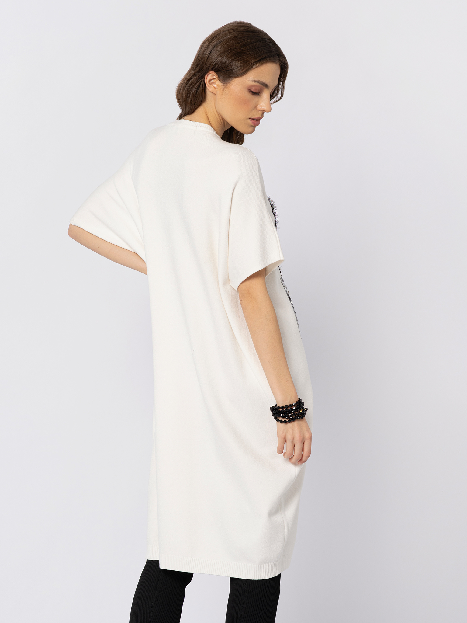 Ecru dzianinowa sukienka z ozdobnymi aplikacjami