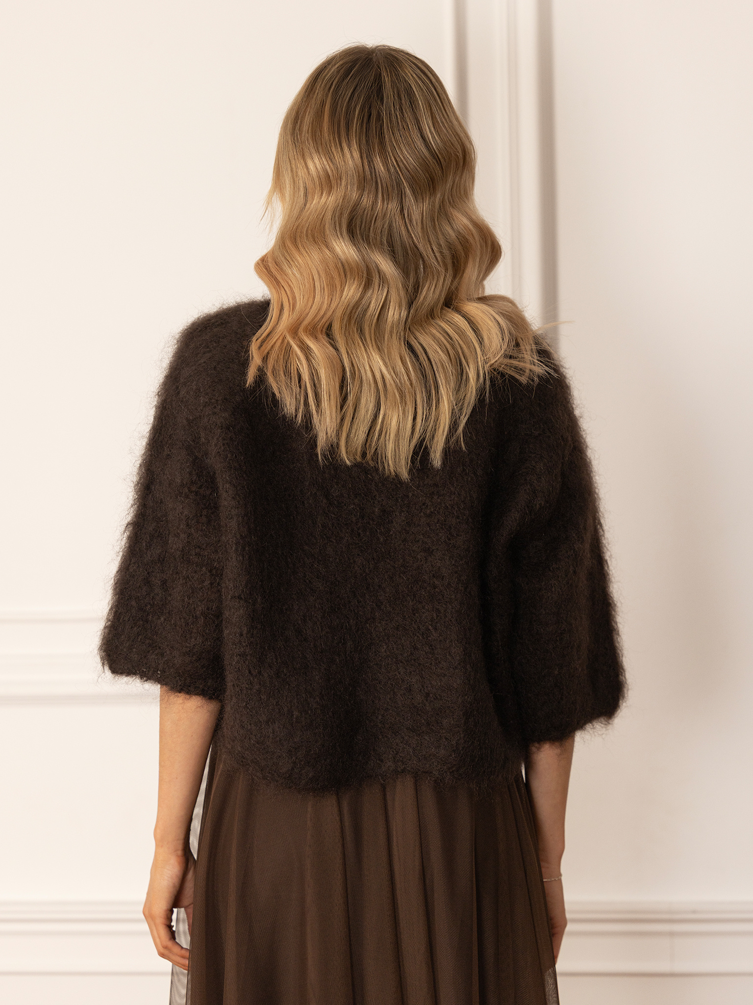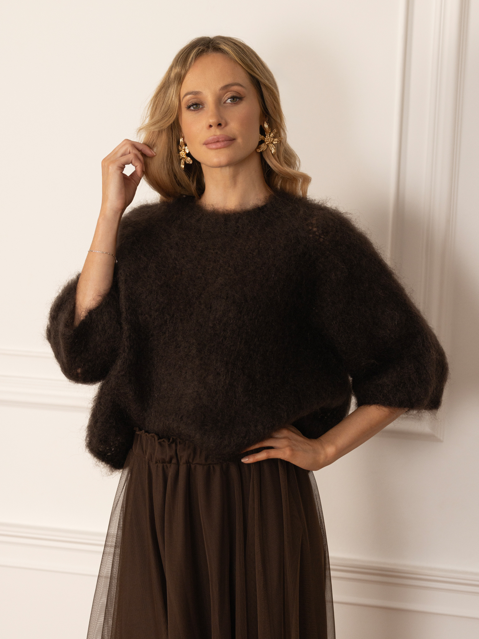Czekoladowy odcień dodaje ciepła każdej stylizacji i świetnie komponuje się z satynowymi spódnicami, tiulem czy jeansami. To sweter, który tworzy efekt effortless chic — miękko układa się na sylwetce i zawsze prezentuje się z klasą.